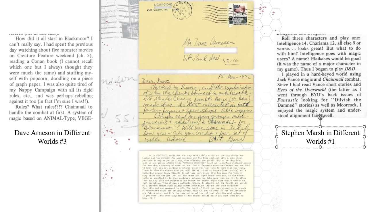 b) 1971-ish Chainmail — Incorporation of some elements of Chainmail for combat. This is based on Hobbs’ research and sharing of Dave Megarry’s character sheets. Arneson affirms this in Different World #3 and it is further verified by Gygax asking for his revisions in the postcard.