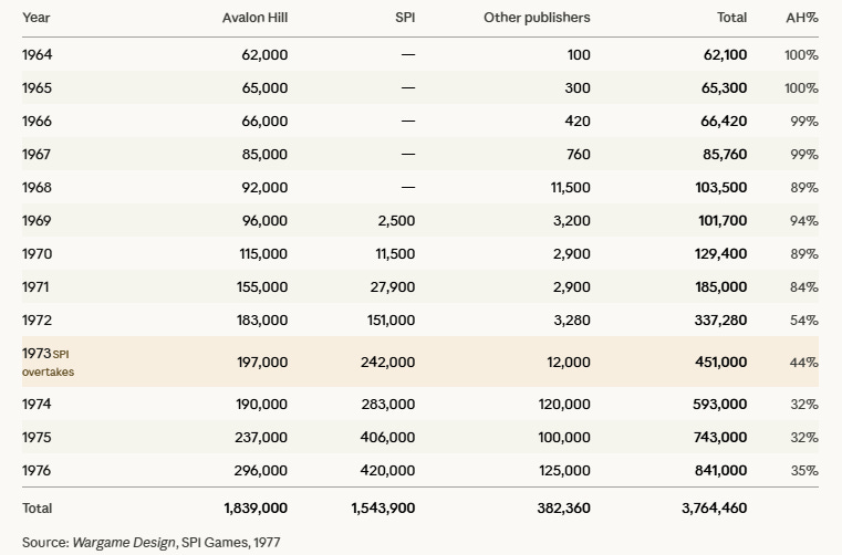 In 1976 there were at least 841,000 sales in the wargaming market. Business was booming, but by 1982 SPI would be owned by TSR and eventually Avalon Hill would be absorbed by Wizards of the Coast (who own TSR). Wargaming thrives today. There are a host of companies ranging from desktop publishing to medium sized business (GMT Games). While it thrives, it is not the giant it was trending to become. The thoughts on design from that time are an interesting read and are both informative and a cautionary tale.