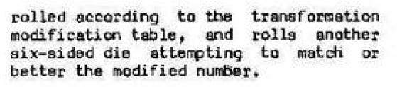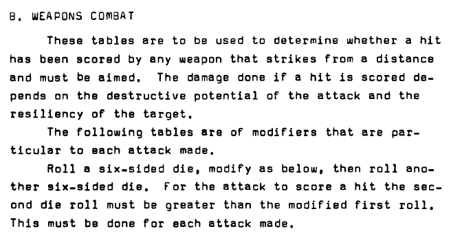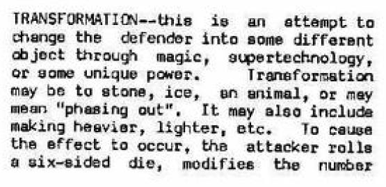 Whether a player character hits their opponent with a Transformation attack or in ranged combat is decided by rolling a six sided die and adding/subtracting to the die total applicable modifiers. This sets the target number that must be rolled, or higher, on a second roll of a six sided die. While the modifications for a Transformation attack are limited to the species or material make up of the target, inanimate objects being the easiest to transform, ranged combat has a long list of modifiers.
