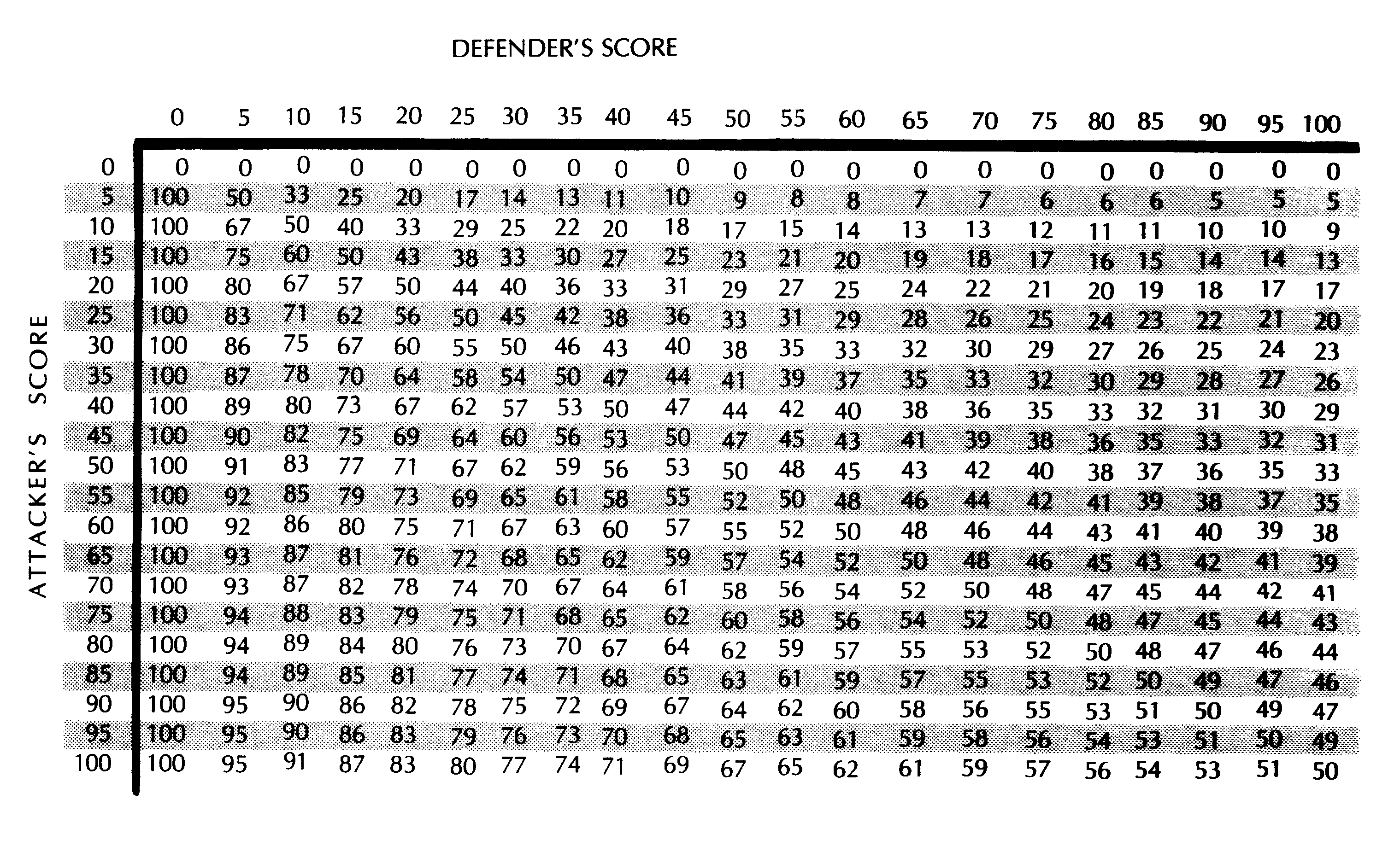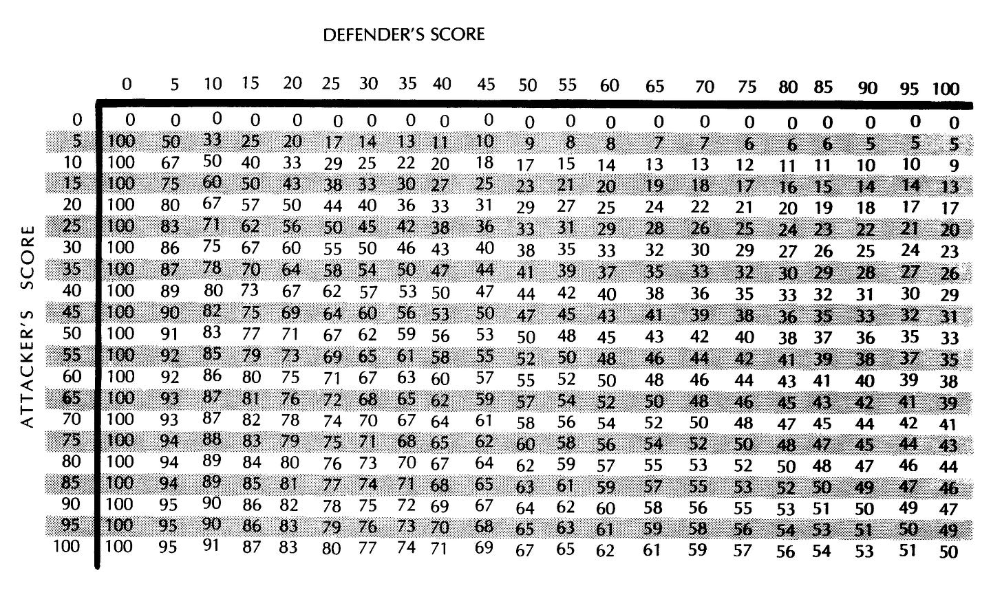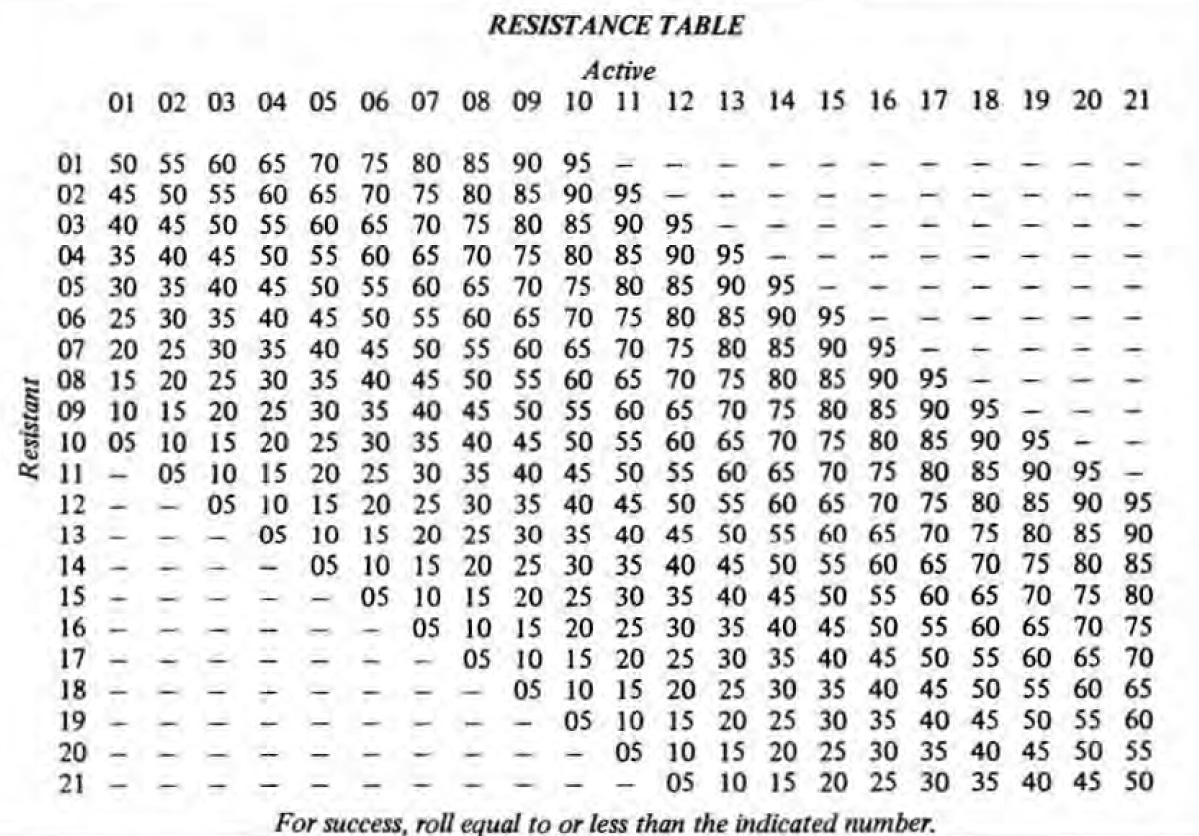 If you take any of the values from the Resistance table above, multiply it by five, and put it into the calculator, you will get a similar result that is in the ballpark of the Runequest probability. This is because like many things in Runequest, when converting things from statistics (or in this case intensities) to probabilities you multiply them by 5% to get the percentage chance. If you merely compare in steps of 1 to the results in steps of 5, you do get a similar but more granular result in Supergame. Regardless, when you compare the charts you can see that the resulting probabilities are Runequestian in nature. The main difference is Runequest’s adherence to a 5% step system instead of Supergame’s ratio system.