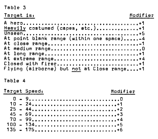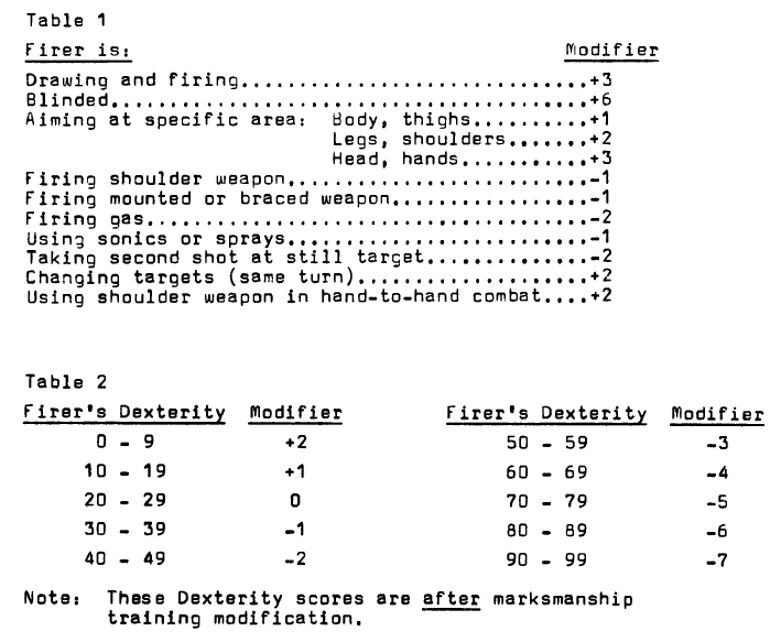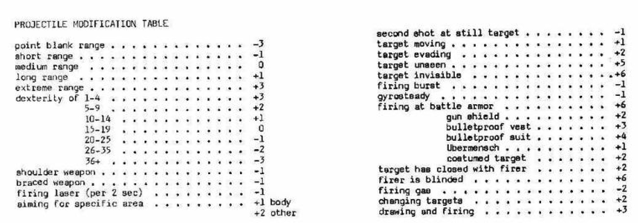 In Superhero 2044, a character with a 20 Dexterity (-1) shooting an opponent at point blank range (-3) with a shoulder weapon (-1) rolls a 6 on a six sided die. This gives a modified result of 1 (6-1-3-1=1) and means that the character hits if the player rolls a 1 or better on the second roll. This system, with some differences in modifier values, is the system used in Supergame. Take a look at the description from Supergame for weapons combat, which are specifically for “any weapon that strikes from a distance.”