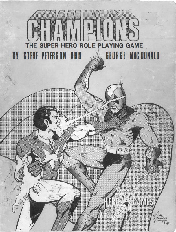 As I mentioned earlier this week, I’ve been a fan of Super Hero role playing games for as long as I can remember. My first experience with Super Hero gaming was Hero Games' excellent Champions 2nd edition role playing game. I was visiting a friend’s house when I noticed he had a saddle stitched book with a black and white cover that featured to super powered people fighting one another. I didn’t recognize the characters from any comic book I’d ever seen before, so I asked my friend about the book. He told me that it was a super hero role playing game called Champions and offered to let me borrow it since we wasn’t currently playing any role playing games.