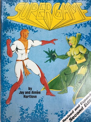 My love of super heroes and super hero games led me to purchase Villains & Vigilantes, Marvel Super Heroes, and DC Heroes, all of which have their charms. Eventually I came across Supergame, an early super hero role playing game designed by Jay Hartlove and Aimee Karklyn/(Hartlove).