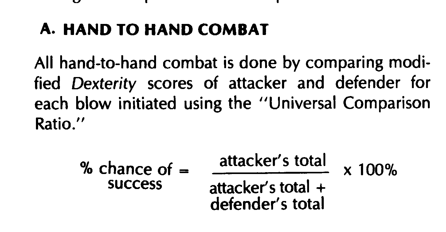 From what I can see, Superhero 2044 wasn’t the only game to influence Supergame’s combat systems. The melee combat system echoes elements of Runequest’s/Basic Role Playing’s “resistance” table which compares intensities to get a percentage likelihood of success. Where Runequest uses a skill system with percentile based proficiency by weapon/category for melee combat, it uses a comparison table for the effectiveness of poisons/magical effects on individuals where you compare intensity to a stat to get the percentage chance to resist the effect.