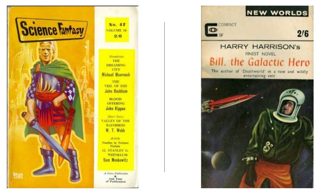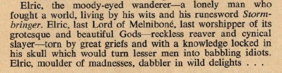 Anyway, the video argues that Del Rey killed fantasy by making it formulaic, more on that in a minute, and that Moorcock’s fantasy was a reaction to Del Rey-ian Fantasy. It cannot be denied that Moorcock was a champion of the New Wave in Science Fiction and Fantasy of the mid-1960s. As Moorcock wrote in his introduction to the 2002 edition of Harlan Ellison’s New Wave call to arms Dangerous Visions, Moorcock’s New Worlds was the European equivalent of what Ellison would do with that seminal New Wave Counter Culture SF anthology. Moorcock had introduced his Jerry Cornelius character, the SF Elric, in the August 1965 issue of New Worlds in the story Preliminary Data, an issue that also introduced Harry Harrison’s Bill, the Galactic Hero who deconstructed a lot of the Space Westerns of the pulp era. Moorcock’s Elric had already been introduced in the June 1961 issue of Science Fantasy magazine. Elric himself a deconstruction, a loving one as I mention in the video, of Conan the Barbarian. Compare their introductions below and see the parallels, which become more explicit in later tales.