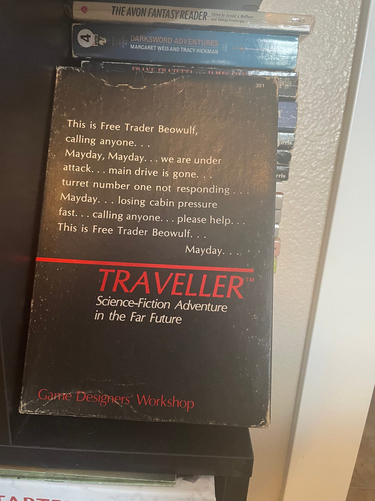 Fans of Asimov’s Foundation stories would instantly recognize from this message that Traveller is a science fiction role playing game. The references to “Free Trader” and “losing cabin pressure” echo the “The Traders” like Master Trader Eskel Gorov from Asimov’s stories.