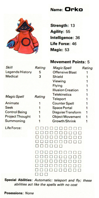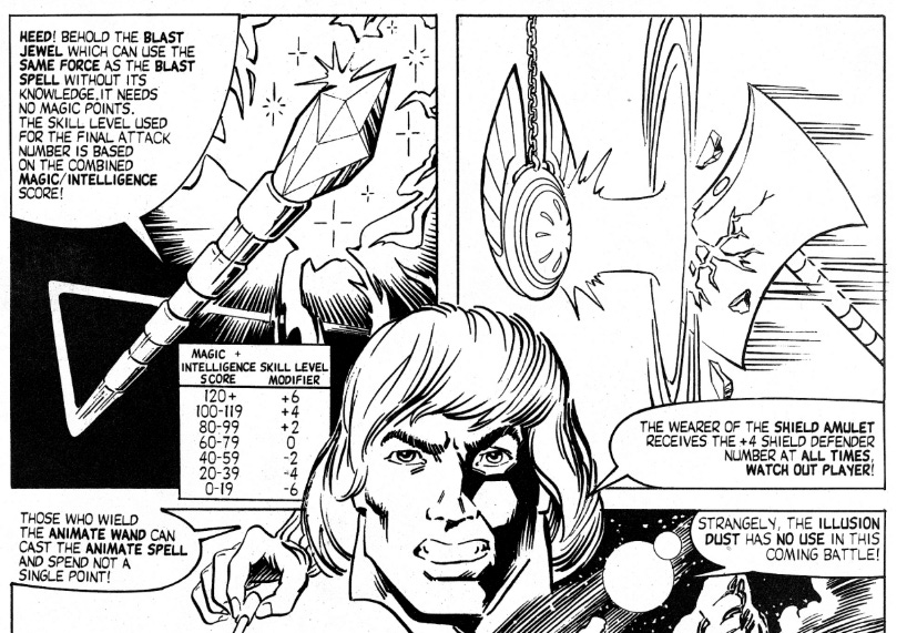 Fans of Steve Jackson’s various games will recognize this as an opportunity to use the inventive d66 which produces 36 numbers between 11 and 66 in order to determine success or failure, but that’s not how Attributes are used in Masters of the Universe. In fact, Attributes other than Life Force (hit points) and Magic (which provides the spell point count for those with spells) dont have much use in the game. The one exception is Intelligence, which when combined with magic provides the character’s basic Skill Level with Magic Items. At least I think it provides the skill bonus for all magic items (that require a skill roll), but it’s only specifically mentioned for the Blast Jewel magic item.