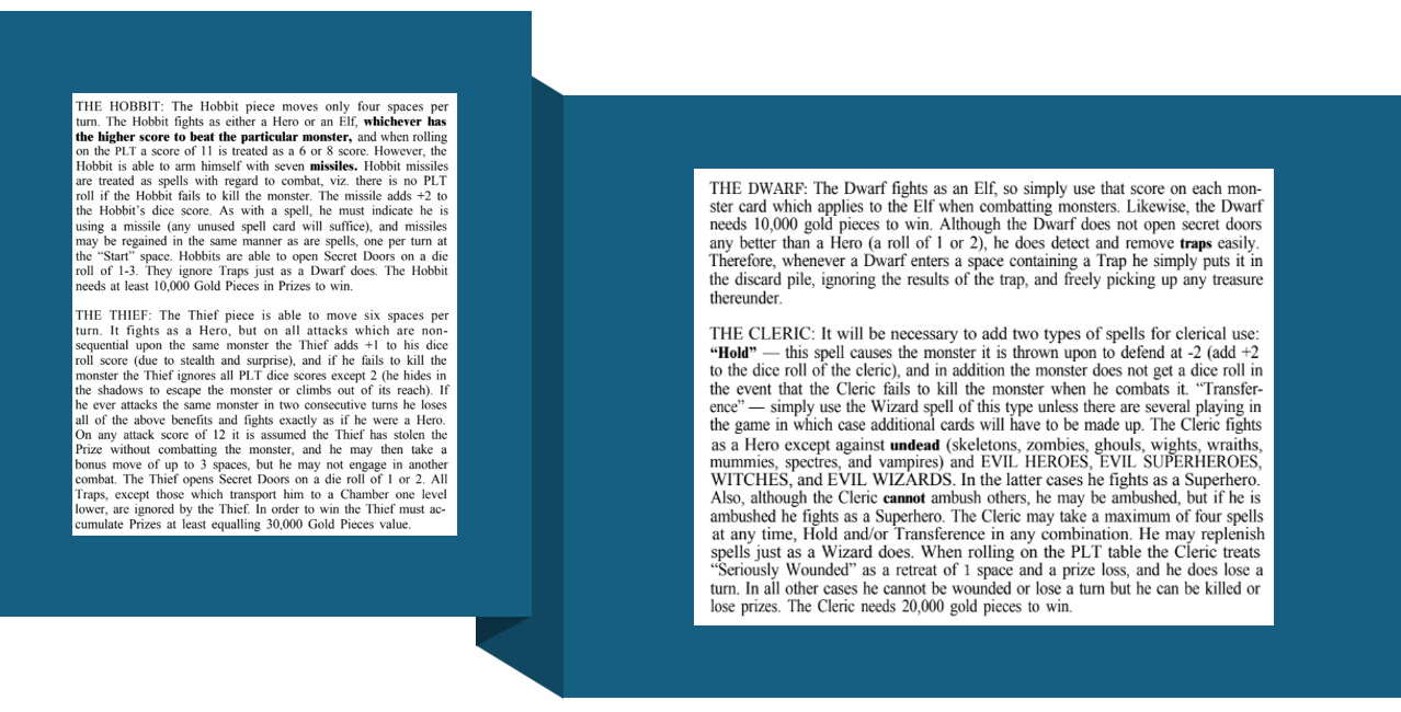 TSR also quickly provided some alternative characters with the addition of the Dwarf and Cleric in The Stategic Review vol. 2 no. 1 and the Hobbit and Thief in Dragon #1. While no rules for designing character classes were presented, the addition of new character classes fueled the role playing feel of the game. If Fasa followed suit with their Masters of the Universe game it could work and as testimony to the possibility, I’d like to add that versions of teh Dungeon boardgame have been published for decades and it is a popular and easy to play game.