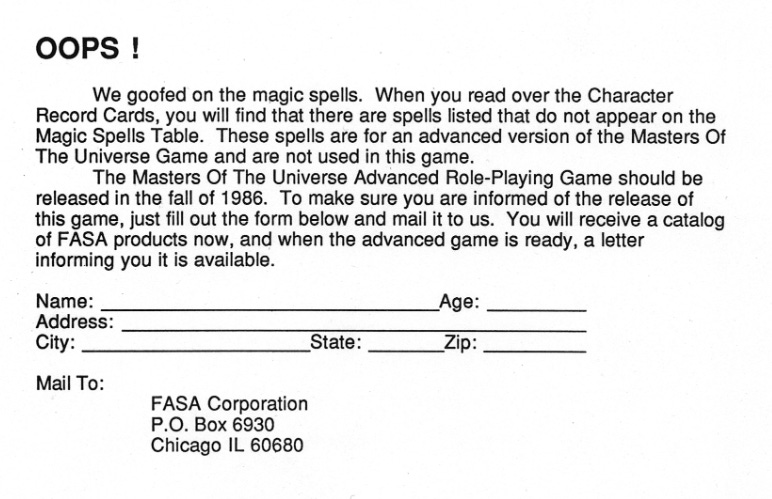 Sorry for the Orko digression, but the biggest gap in the game is hinted at on his character sheet. You see that big list of spells? Yeah, there are only rules written for six of those and even then the effects are pretty vague. Shrink/Grow let’s you grow to twice your normal size, but so what? It doesn’t do anything else. That’s fine if you’ve got some suggestions for how to referee a game and tell a story, but in a combat focuse boardgame introduction it’s pretty terrible. The designers knew this was a HUGE error and that’s why they printed the famous (or famous amongst RPG obscuria nerds) OOPS! card. This card apologizes for leaving out the rules and takes the opportunity to say “Our bad, but the thing we left out will be in our advanced version and let us tell you when you can buy it!” It’s just like modern video game devs selling DLCs that are really just patches to the main game.