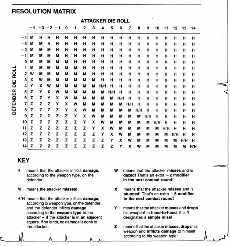 The more I’ve played the game solo (I printed a copy out as there is no way I’m punching my copy are you kidding?) the more intuitive the matrix has become and it’s definitely usable as the foundation for a resolution system. However, the full potential of this chart is never realized. The base “difficulty” of casting a spell is 3, but they could have made things more interesting by varying that difficulty based on circumstances of casting (they do vary it in melee combat) or by having character Attributes add bonuses to the resistance of various actions. As I write, there’s real potential here, but it isn’t taken advantage of and that leads to some confusion in the rules.