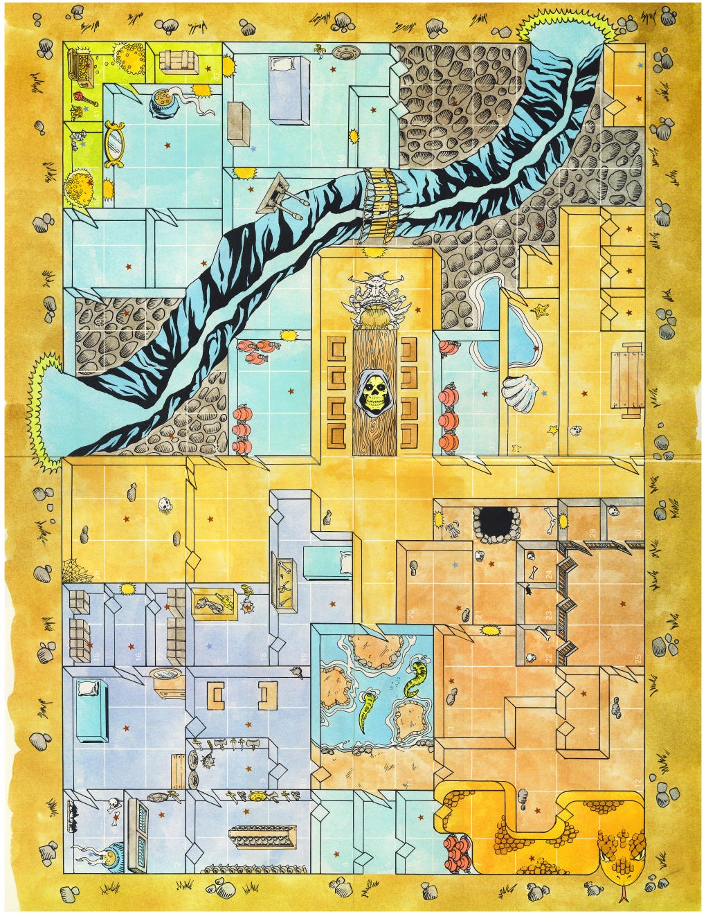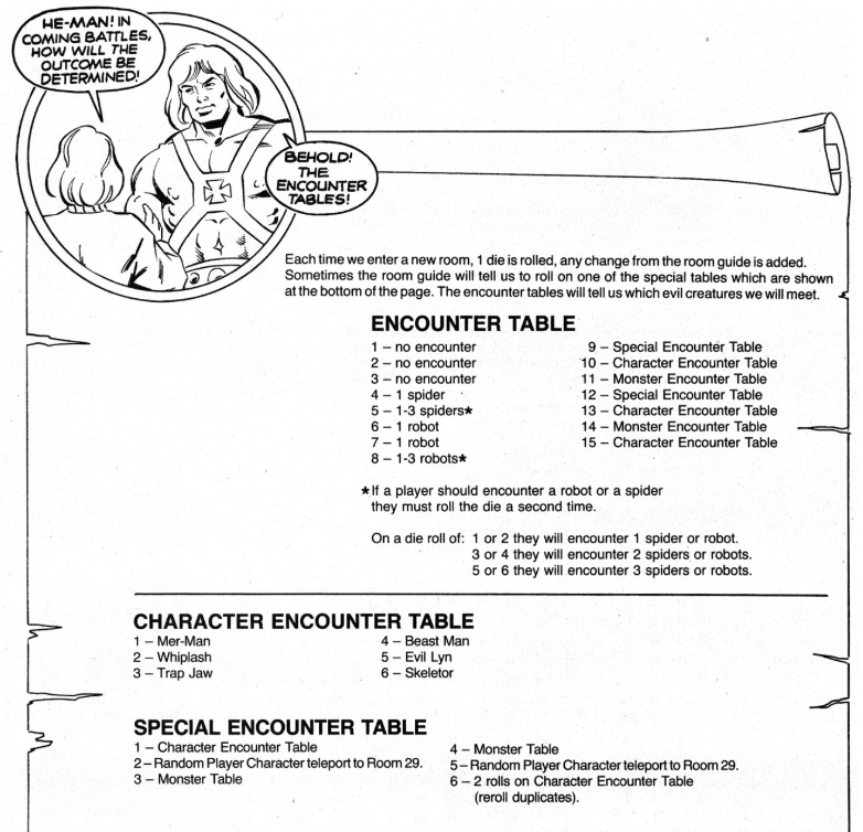 The numbering of the rooms is a standard role playing game module feature that allows Dungeon Masters to look up the room number and tell the players who and what they find there. That’s not exactly how things work in Masters of the Universe. In this game, most of the encounters are random. To determine who the player characters encounter when entering the room, the game master (Skeletor in this game) rolls a six sided die and then adds a modifier based on ther room to see what kind of encounter the players’ characters will face. For example, in the Secret Passage (#21) you add +4 to the roll of a six-sided die giving you a possible range of 5 to 9. This means that the characters could encounter anything from 1-3 Spiders to a “Special Encounter” that could include any one of the 6 villanous characters included in the game (Mer-Man, Whiplash, Trap Jaw, Beast Man, Evil Lyn, and Skeletor).