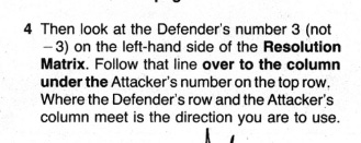 Key to conflict resolution, and casting of spells other than Shield, in the game is the handy dandy Resolution Matrix! Though combat matrices were the rule of the day in the mid-1980s when this game was published the Masters of the Universe Matrix is a high mark in lack of clarity. Sure, Advanced Squad Leader players can decipher it, but the average new gamer would be befuddled by the array of letters and numbers. To add to the confusion, when casting magic the player compares their roll to a 3 on the Defender’s number column.