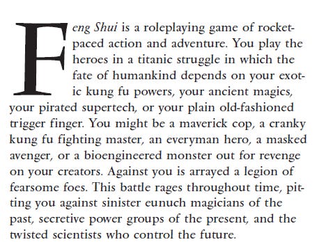 , argued that K-Pop Demon Hunters was perfect for a role playing game setting, but now it’s time to find the perfect game and that was extremely easy to do. That game is Atlas Games’ Feng Shui role playing game. The introduction from the first edition of the game explains, in part, why the game is such a great fit. It’s not just because it’s a game designed to capture the kinds of action featured in East Asian cinema, though it’s partly that, but also because the game is extremely easy to play and learn.The basic mechanics are that a player rolls two six-sided dice, one a positive die and one a negative, and they get a result from -5 to +5 that they add to their skill in a particular area, and most player characters are extremely skilled in some areas. The combat and damage system are fast and furious and the list of abilities is extensive.