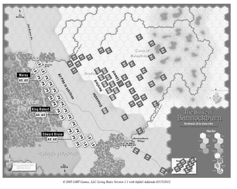 Falkirk is a wonderful example of this principle. Berg’s design note states flatly that the Scots pike formation “was basically immobile (until it broke and ran)” and that in the historical version, “it is almost impossible for the English to lose.” Edward I had analyzed why Surrey lost at Stirling Bridge and he shifted to a more flexible army of footman to combat Wallace’s pikemen. The immobility of the pikes makes this a great solo scenarion and Berge offers the non-historical variant where the Scots can actually maneuver for those who want a competitive two-player game. That’s a designer making a choice Hill would recognize immediately. In Falkirk, the effect being modeled is Edward I adapting to the new realities of the battlefield, and the scenario is structured to generate that effect rather than to pretend the battle was closer than it was. The historical Falkirk is practically a proof-of-concept demonstration. Wallace’s schiltrons are formidable against cavalry, but they were also immovable and this ultimately doomed them because they were not fighting mounted troops. The game doesn’t soften that.