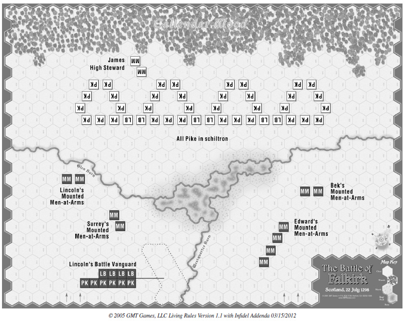 If you’re new to the system, start with Falkirk. It’s a very straight forward scenario that is designed for ease of play as a solo experience. The best way to learn a game is to play it and Falkirk lets you play it before you try to talk one of your friends into coming over to play Bannockburn. Besides, if you play Falkirk solo as the Scots you’ll build up enough resentment at having been crushed by the English that you’ll play with all your cunning and skill when your friend plays the English at Bannockburn. On second thought, if you want your friend to play again, you might want to play the English instead and let your friend win.