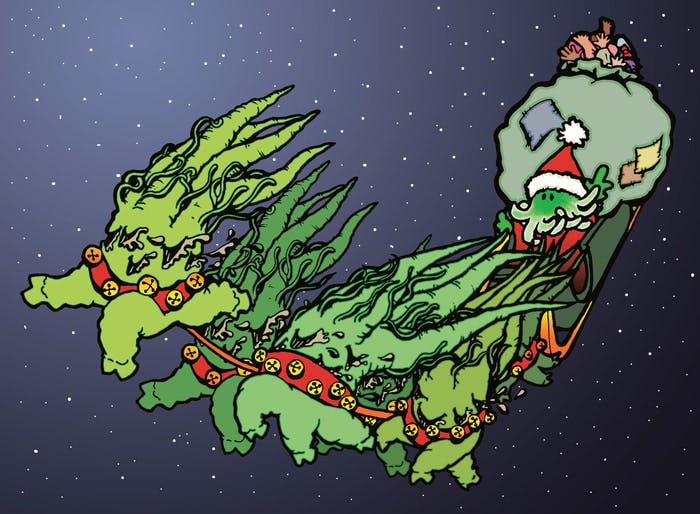 We wanted something that would have some interest in the gaming community, was easily producible, had scalability if it succeeded, and that we could use the new-ish Kickstarter platform to launch the product. I did some market research and got some printing estimates and pitched the Cthulhu Claus Greeting Cards idea to my partners. They agreed that it was a good idea and we discussed who should write the text and do the illustrations for the product.