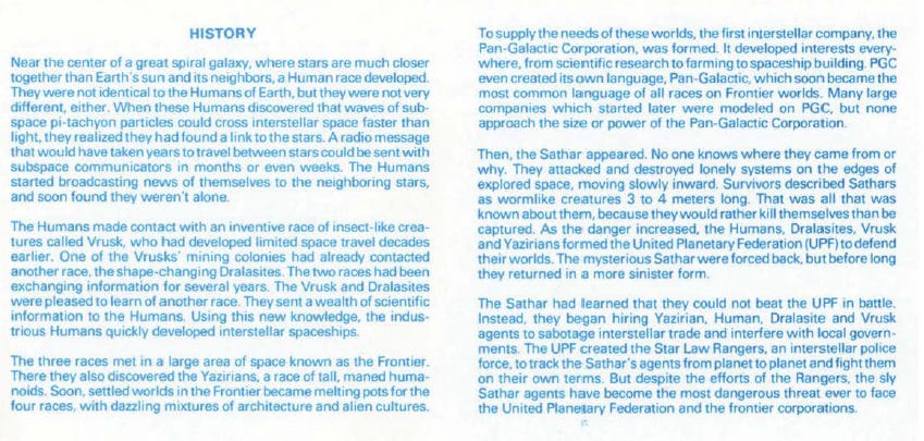 While expanding into the Frontier, they soon discover a new enemy, an enemy that threatens to destroy any civilization that chooses to explore the safety of the central galaxy. That enemy is the Sathar, a wormlike race with hypnotic powers on the edge of explored space. The exploring races have only recently completed their First Sathar War, during which they formed the United Planetary Federation, and are now having to deal with terrorist attacks and sabotage by agents of the Sathar...agents from among their own people. In response to the Sathar’s new warfare strategies, espionage and terrorism, the UPF has formed the Star Law Rangers who track Sathar agents and attempt to foil their plots.