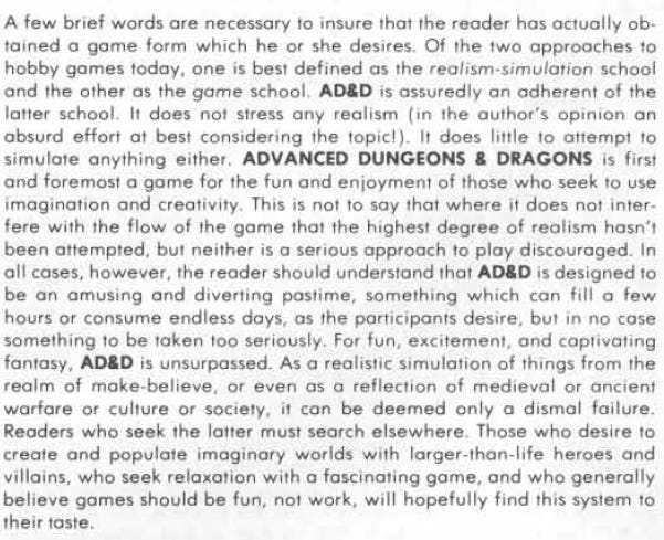 In his paragraph on design intent, excerpted above, Gygax clearly puts himself in the "abstraction" design camp. His discussion of Hit Points in the DMG also makes this clear, whereas those who criticize hit points or how armor "makes it harder to hit and doesn't stop damage" fall more into the Simulationist camp. I would like to say that I disagree with Gygax that his game "does little to attempt to simulate anything." I would argue that it is simulating heroic fantasy, but it is doing so from an abstractionist position. It's a small distinction, but not an unnecessary one.
