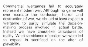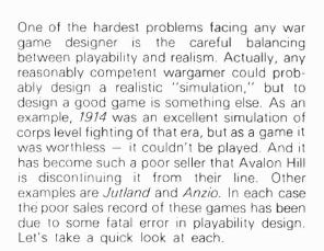Historically, the conflict that informed John Hill’s design was the tension between "realism" and "playability." In Issue 8 of Moves magazine (1973), Victor Madeja argued that "Commercial wargames fail to accurately represent modern war. Although no game will ever recreate the confusion, horror and destruction of war, we should at least expect a wargame to partly simulate the decision-making process involved in actual battle. Instead we have chess-like caricatures of reality. What semblance of realism we were led to expect is sacrificed on the altar of playability" (Emphasis mine). For Victor, there was a clear distinction between realism and playability and he thought that games at the time leaned too much toward playability and not enough toward actual simulation .