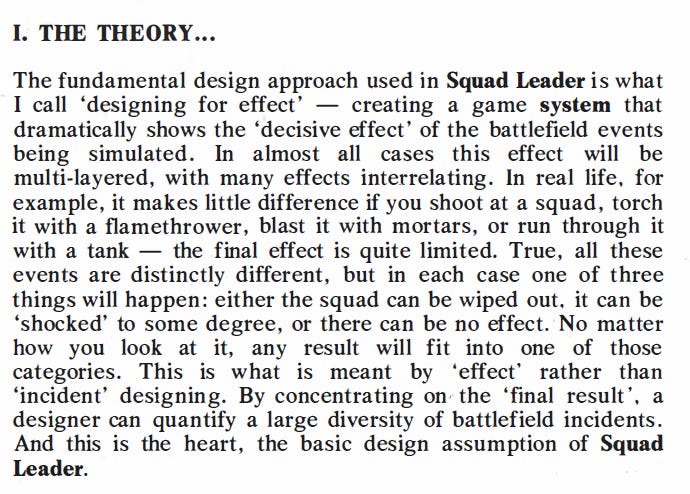 The use of simulation as an axis descriptor here is a little different from what Ryan means in his piece, in that the entire axis represents what a game is simulating rather than whether it is simulating. That’s because this builds upon the classic “designing for effect” versus “designing for incident” debate touched upon by John Hill in his Designer Notes for Squad Leader in Issue #9 of Fire & Movement Magazine.