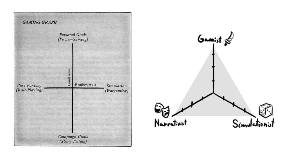 ’s recent post where he rekindles discussion of the Gamist/Narrativist/Simulationist theory that was very popular on Ron Edwards’ Story Games boards of the early 2000s at indie-games. While the theory predated Ron Edwards’ systematic presentation of the GNS Design rubric, he was its most passionate advocate and it gained real traction in his community.I gave a cursory discussion of GNS Theory and compared it to Jeffrey A. Johnson’s Fourfold Way of FRP from Different Worlds Magazine #11 (1980) in my piece on the Swedish Super Hero role playing game Supercrew about a month ago. I’ll be expanding on that discussion in the future, but Ryan’s piece covered one of the main points that I was going to make in my follow up piece, namely that “Gamist” and “Simulationist” approaches don’t stand on their own because all non-abstract games are a kind of simulation.
