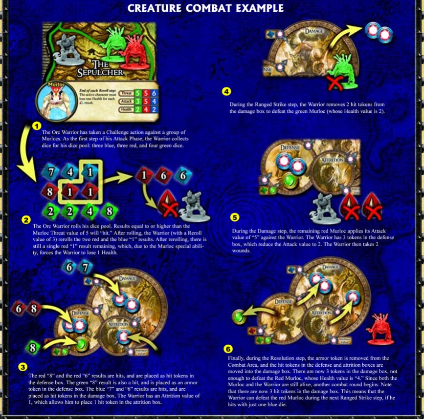 There are two games that I think best demonstrate a pure “Gamist” perspective. These are the World of Warcraft game by Fantasy Flight Games, not to be confused with their World of Warcraft Adventure Game, where the combat system feels more like shifting tokens around endlessly more than it feels like combat. The moving of tokens feels more like it is the game than what it is simulating and it’s not a particularly fun game. It is, however, very fiddly.