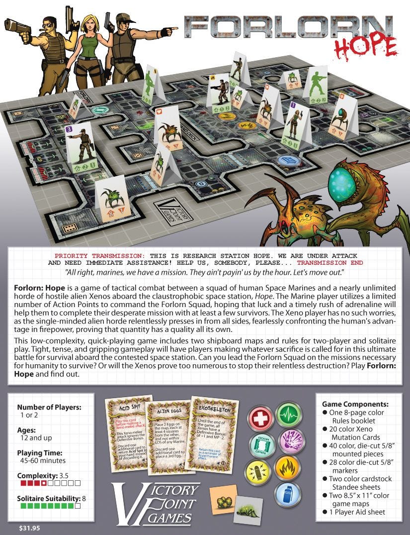 When Forlorn: Hope was initially released, I was jonesing for a new addition to the genre. In actuality, I was jonesing for a game of Space Hulk 1st edition, but was having trouble finding one at an affordable price on eBay. I owned the 2nd edition, but I wanted to play with the original "d6" based rules. During one of my searches, browsed some of my regular website haunts and read one of Victory Point Games bi-weekly reports. I immediately noticed that they were featuring a new game by Chris Taylor called Forlorn: Hope. As I was already a fan of his, and of VPG, I immediately ordered a copy. Not long after this, Games Workshop released a limited edition of Space Hulk 3rd edition which used the mechanics of the 1st edition, so that itch was also scratched. I carried my copy of Forlorn: Hope around for months, but it took a while for the stars to align to put together a play session.