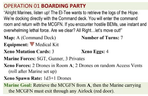 For example, in the “Boarding Party” mission the Marine player us charged with locating and retrieving the “Master Control General Function Neuralnet” (MCGFN aka MacGuffin) and bringing it back to the Airlock. The mission allows the Marine player to have a Sergeant, a Gunner, and 3 Privates and let’s just say that while the Xeno Forces in this first mission are “easy mode” that the mission is far from easy to succeed with.