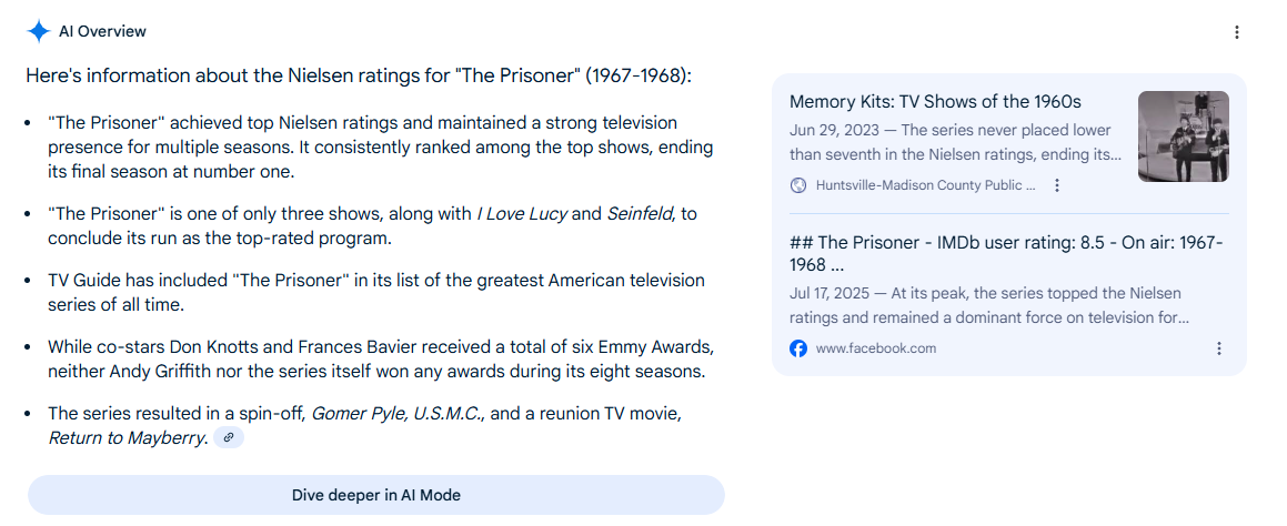 On an interesting note, that ties in with my recent post on AI music, when I was researching the ratings for the show I did a Google search and the AI Overview was hilarious. It claimed that the show ended as the number one show when it was cancelled and that it’s co-stars Don Knotts and Frances Bavier received a total of six Emmy Awards. It was a very The Prisoner moment to read that description.