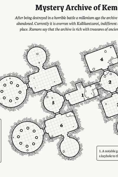After being destroyed in a horrible battle millenium ago, the archive of Kemeia remained abandoned. It is currently overrun with Kallikantzaroi, indifferent to the history of the place. Rumors say that the archive is rich with treasures and ancient books and gold.