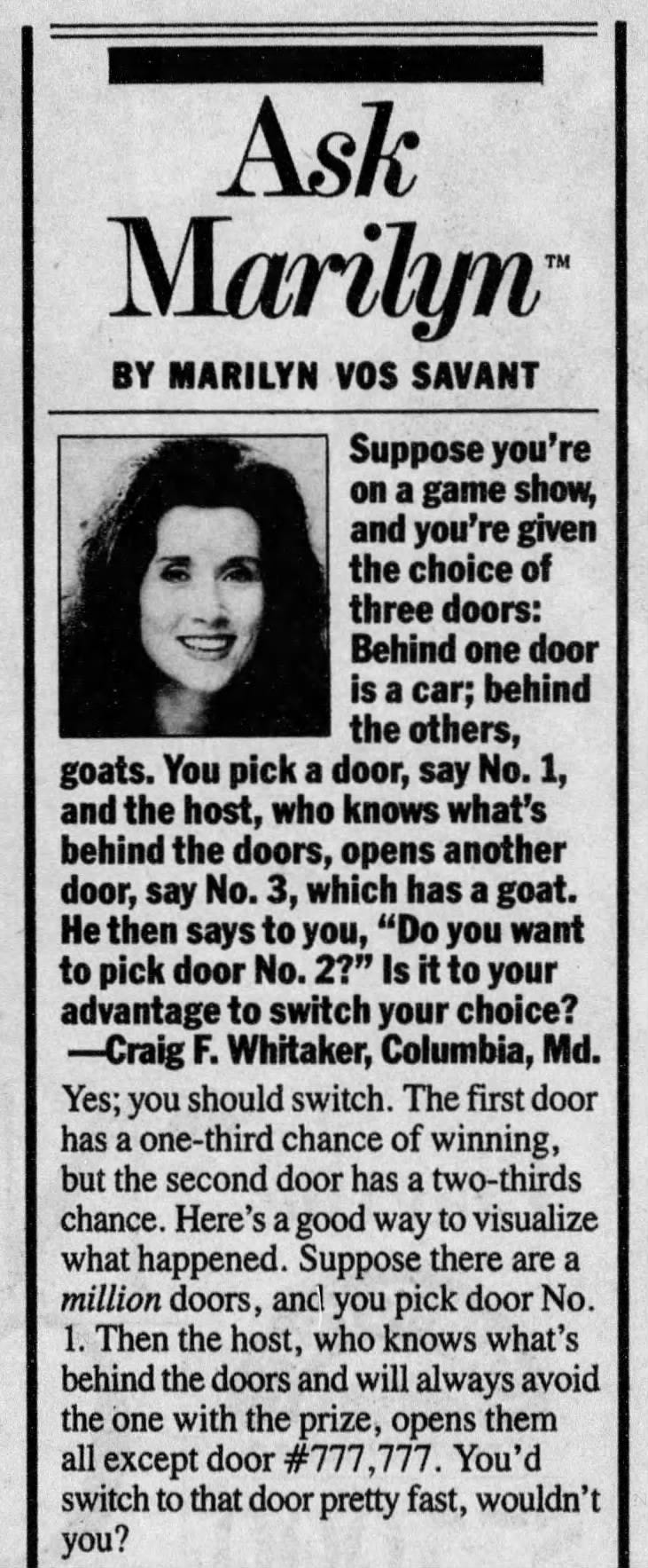 You might think that Monty having shown you where one of the two goats is means that it doesn’t matter if you switch or not, however it matters a lot. In September of 1990 an interesting Ask Marilyn column was run in Parade Magazine. The Marilyn in question was Marilyn vos Savant, a woman who claimed to have the highest I.Q. ever recorded. She received a question from a viewer regarding the Monty Hall problem and provided her counterintuitive solution.