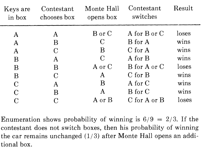 It seems to me that their argument was more of a defense of fellow academics who looked foolish in arguing against Marilyn than an actual rebuttal to her response. She was, in fact, correct that you should always switch. They would have felt less need to defend academia had they looked to an earlier issue of The American Statistician in 1975 when Steve Selvin, a very well respected biostatistician, provided a simple solution (similar to one of those given by Marilyn) in a Letter to the Editor entitled A Problem in Probability. His argument presents a matrix of possibilities, instead of a text description, that makes it easy to see.