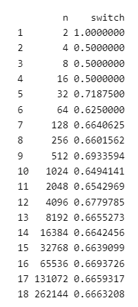 runs <- runs |> add_row(n=trials, switch=(sum(run["Switch"]))/trials)